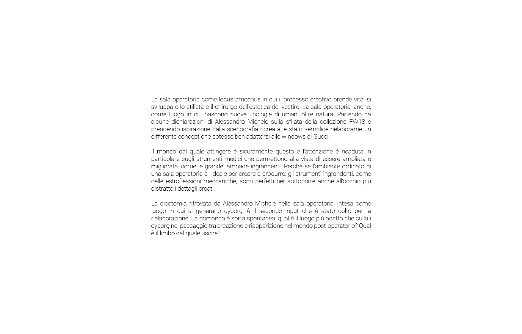 Starting with the theme of FW18, a cybernetic world, and the location of the runway, which is inside a large operating room with beds, green sheets and neon lights, I tried to rework these two concepts into my project.