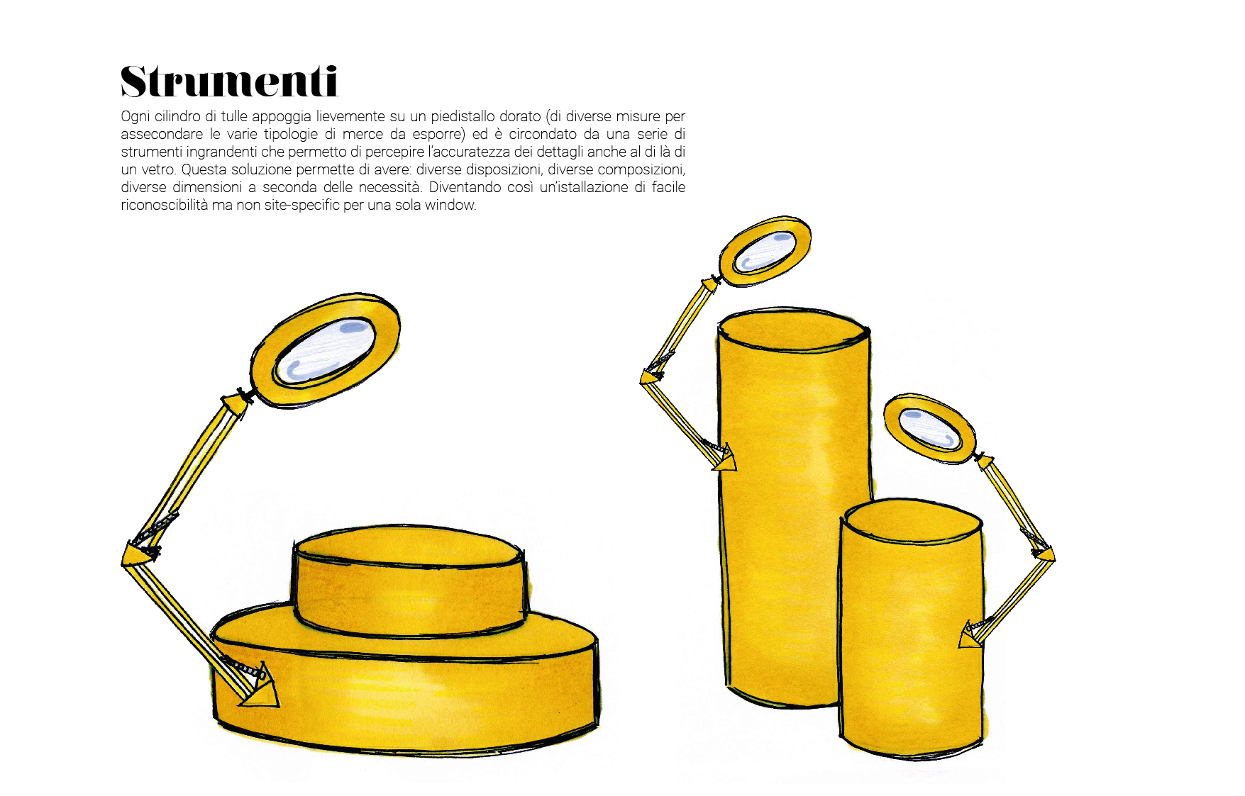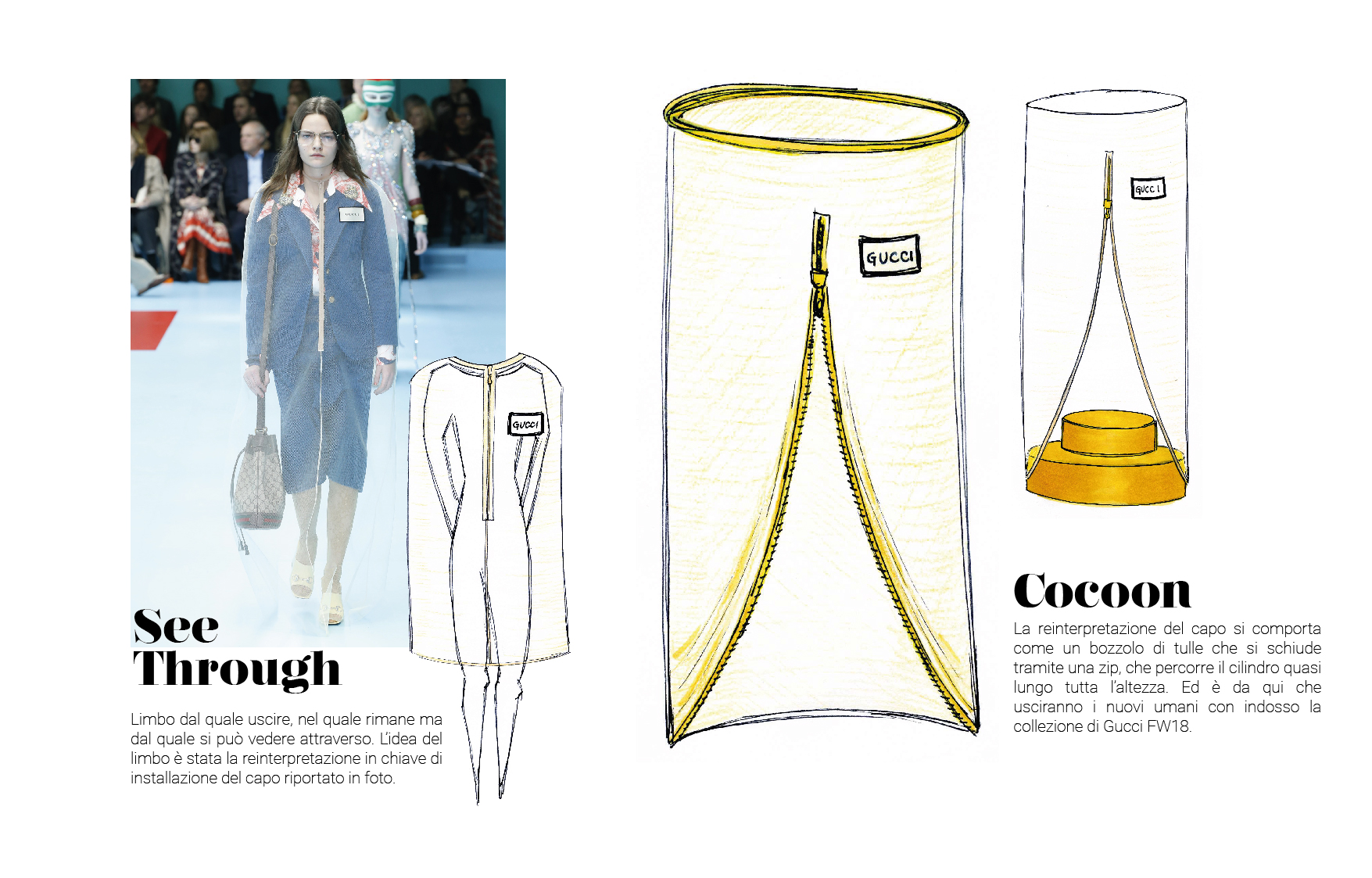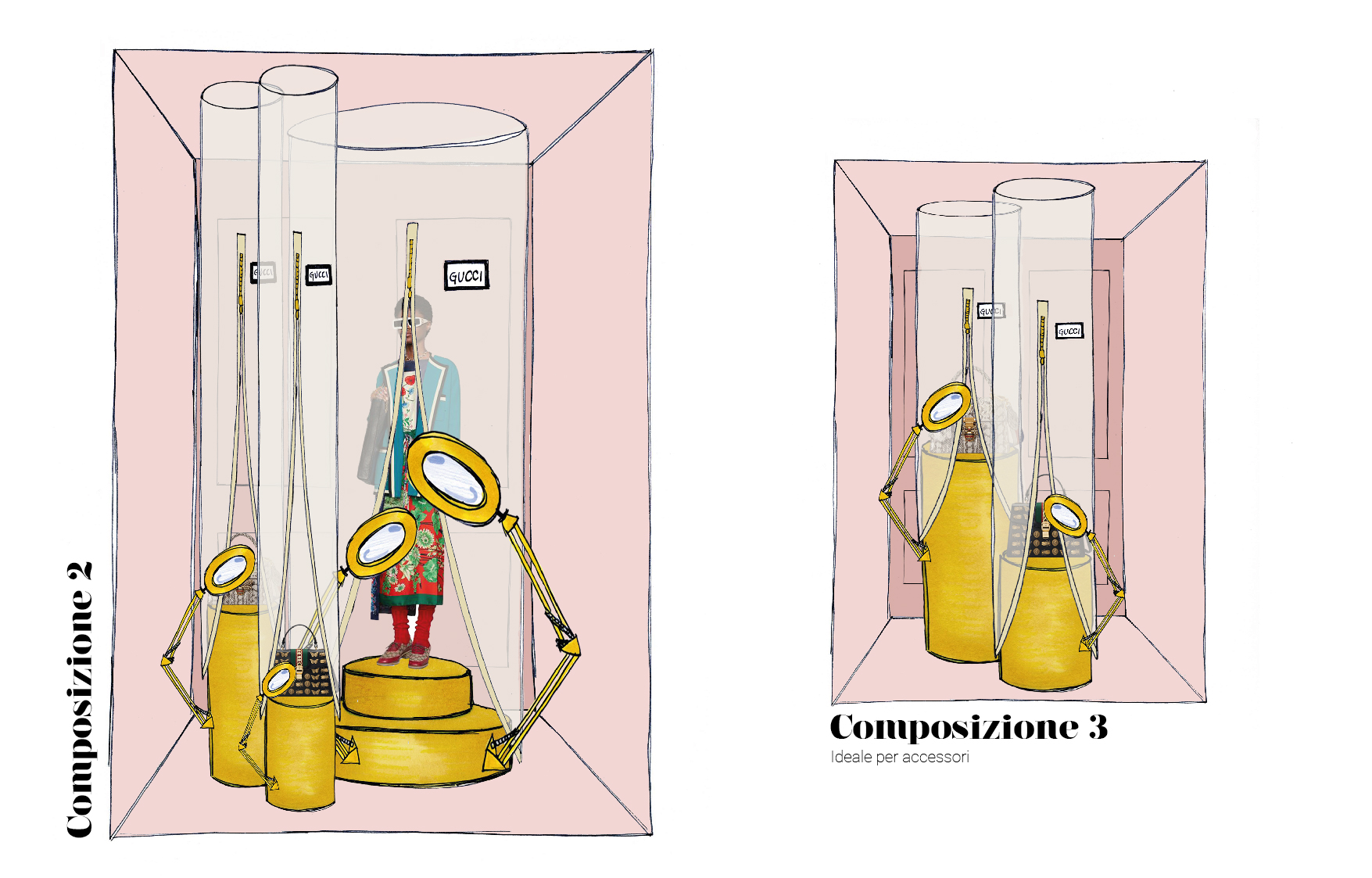 For the first step, I made a moodboard with images of the catwalk, the operating room, and the veil concept (inspired by a cape seen in the fashion show). The next step was to find the elements needed to furnish the showcase. The first was a veil cocoon with a zipper that holds the items to be displayed like a “dust bag”; the second was a set of magnifying glasses; and the third was cylindrical displays. Having identified these elements, it was easy to create different proposals for the different items.