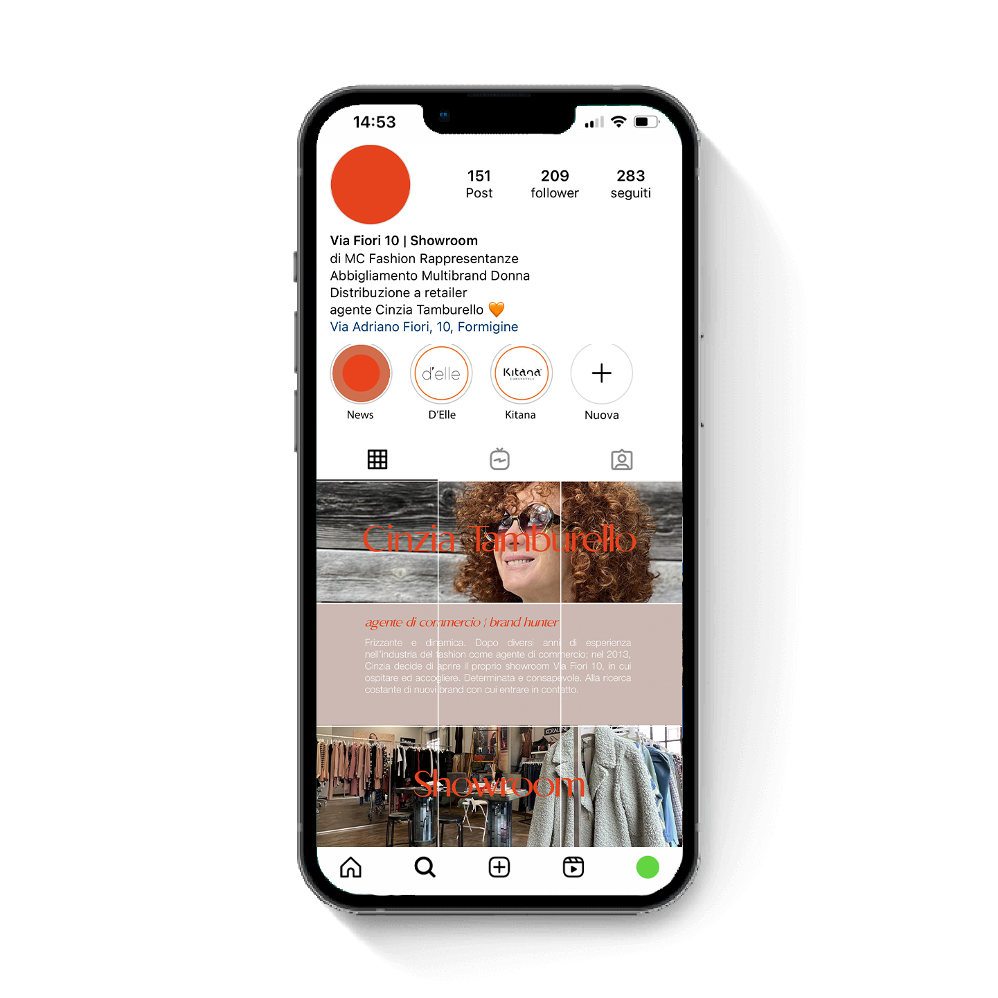 After an interview and knowing the brands represented, the presentation and sales process, it was easy to identify a method to present the collections to customers. The only social channel chosen is Instagram, in the footer the images we chose to describe the space and Cinzia. For each brand collection we decided to post three photos in a row, the middle one with the logo of the brand represented and the two side ones with the photo of the shooting and a video presentation. Each brand has a highlight with a data sheet with type of merchandise, sizes, contract conditions and direct contacts.
