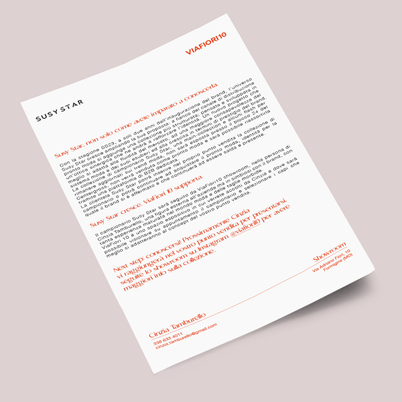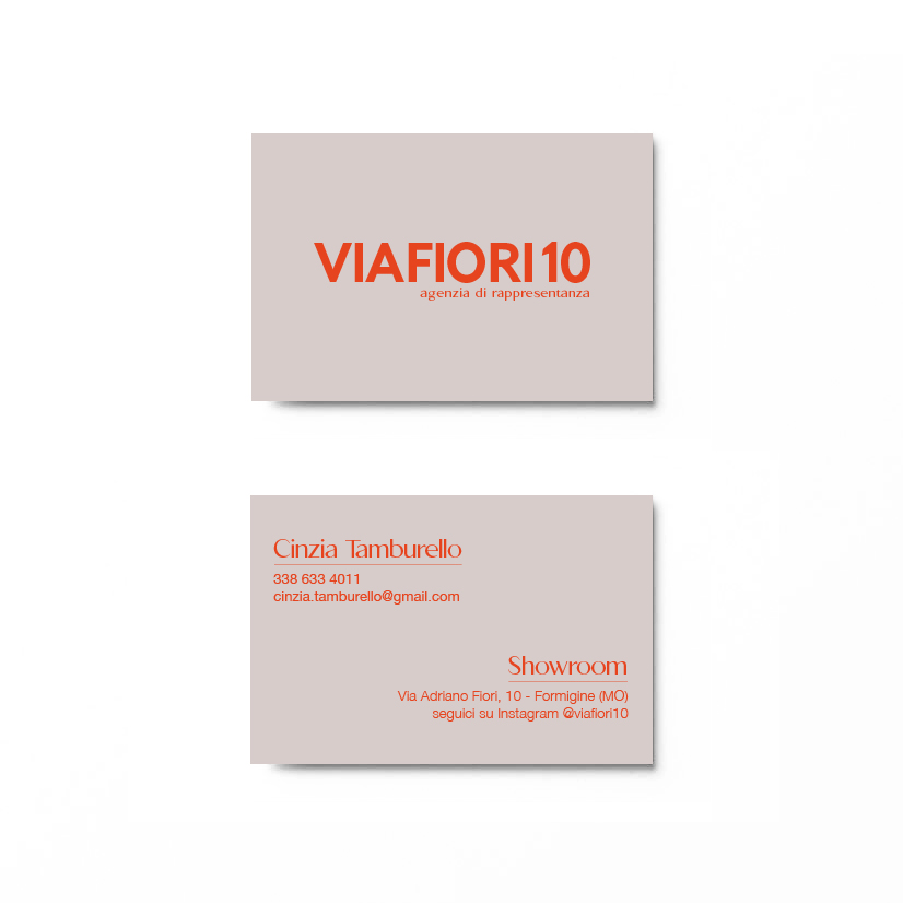 Via Fiori10 is a brand representation studio based in Modena that presents and sells collections to stores throughout Emilia-Romagna. Cinzia, the owner of the studio, after a collaboration on another project, asked me to study a fresh and fast corporate image and a good strategy to communicate her needs.